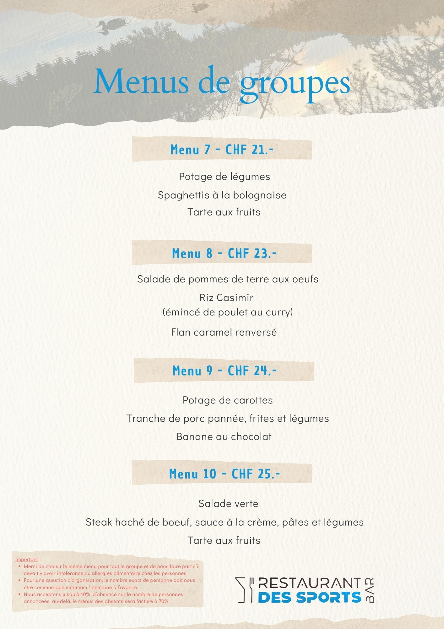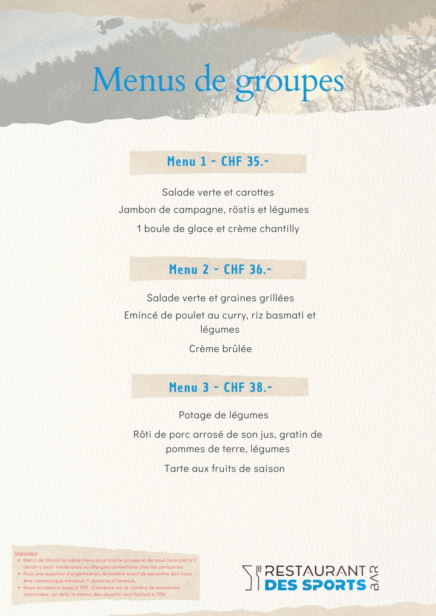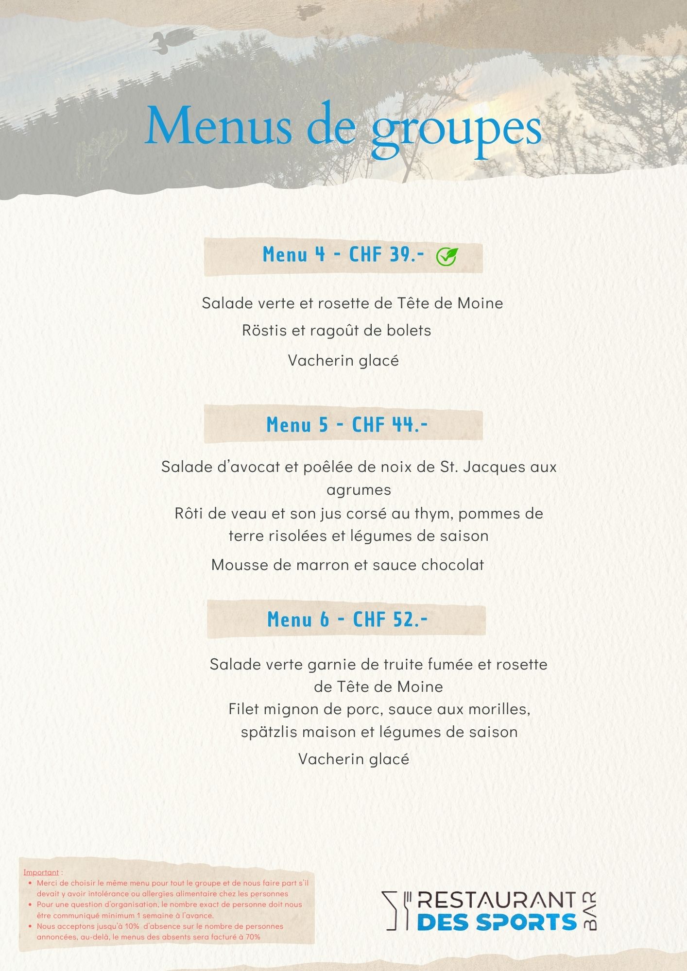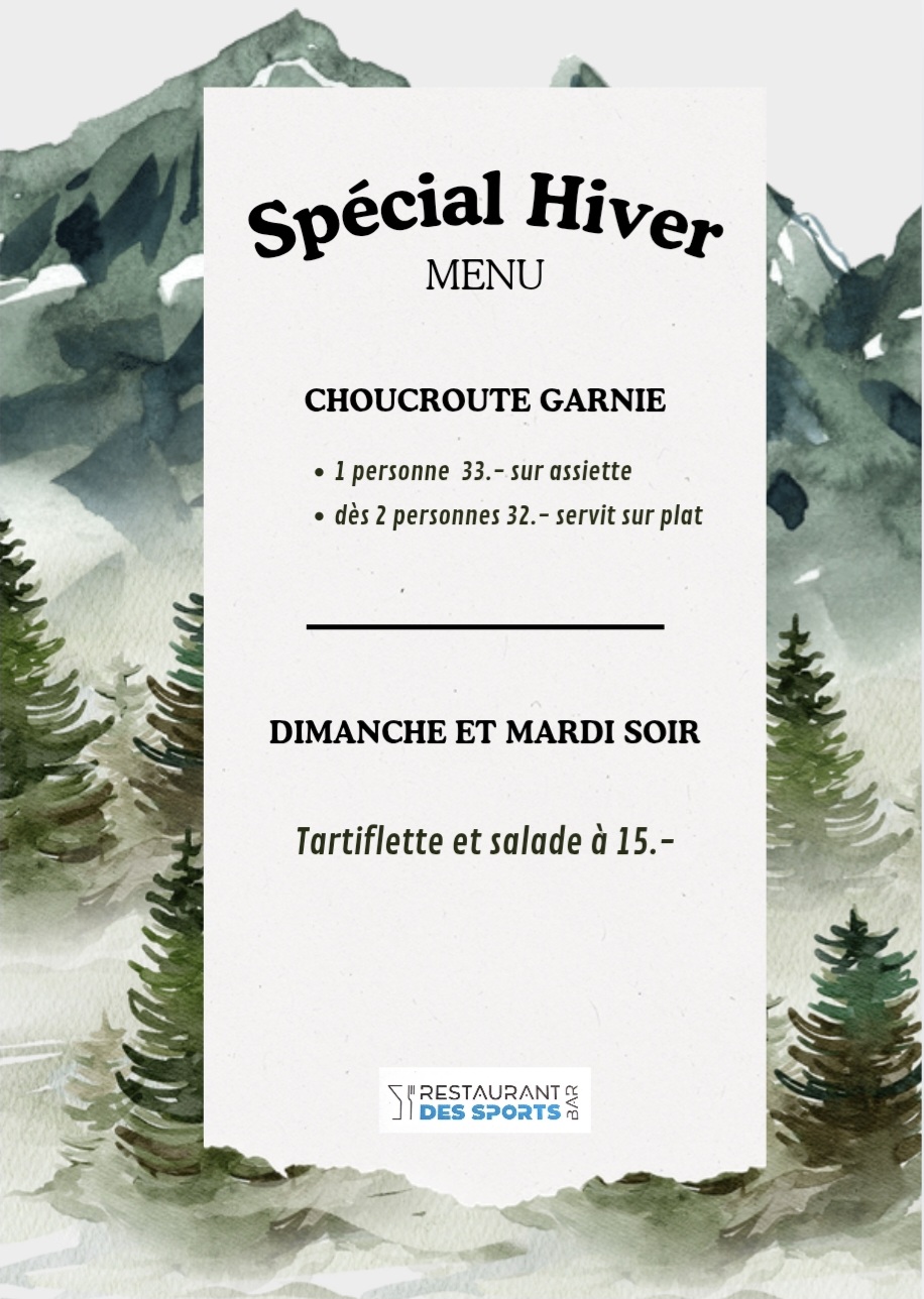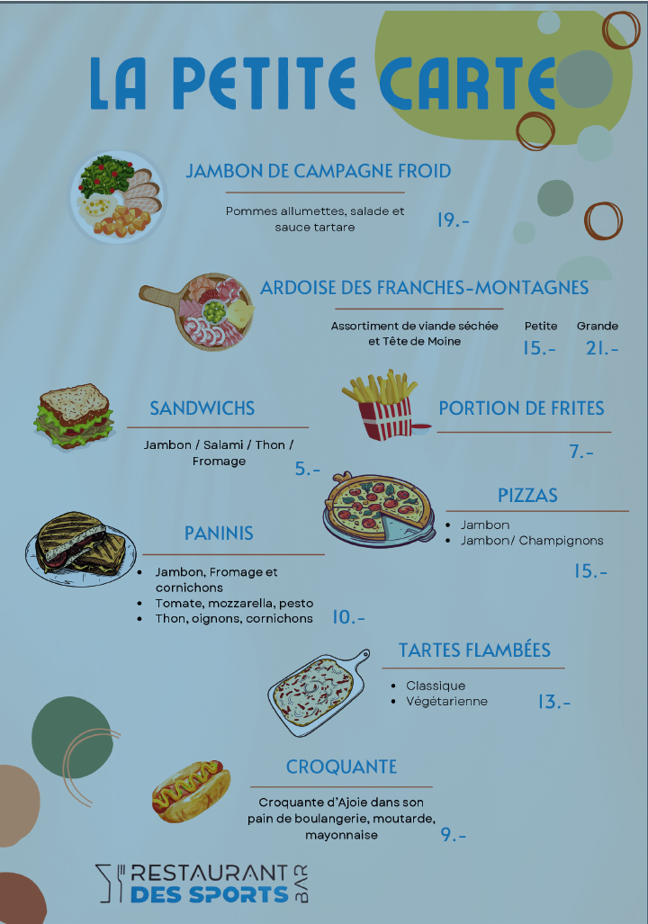 Bienvenue au Restaurant-Bar des Sports, niché au cœur des magnifiques Franches-Montagne. Nous vous accueillons dans une ambiance chaleureuse et sportive, parfaite pour les amateurs de bonne cuisine et de convivialité. Notre menu met à l’honneur les spécialités régionales, préparées avec des produits locaux de qualité, pour vous offrir une véritable expérience culinaire du terroir.